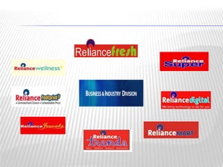 Reliance Group is an Indian conglomerate founded in 1966 by Dhirubhai Ambani with a presence in crude oil, petrochemicals, retail, telecom, and more. Reliance Retail was founded in 2006 and operates various store formats including supermarkets and grocery stores. It faces competition from other Indian retailers like Biyani Group but has strengths in its large private label portfolio and strong parent company backing.