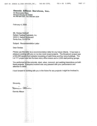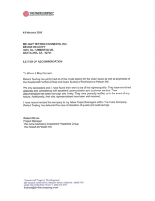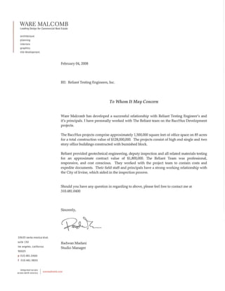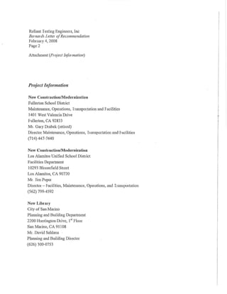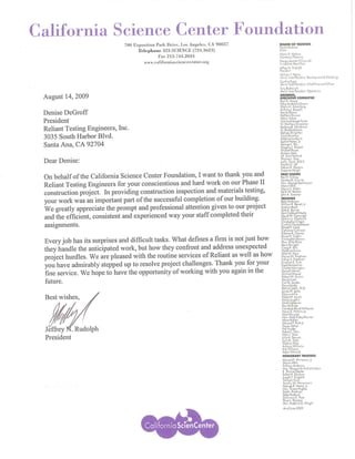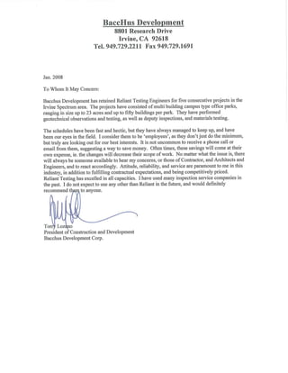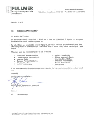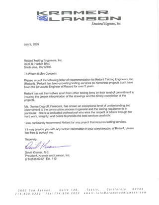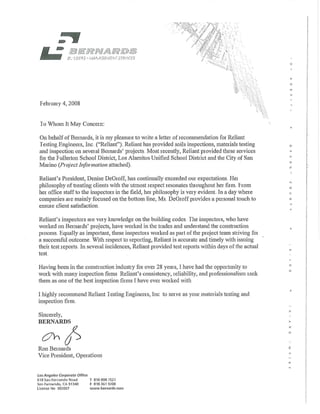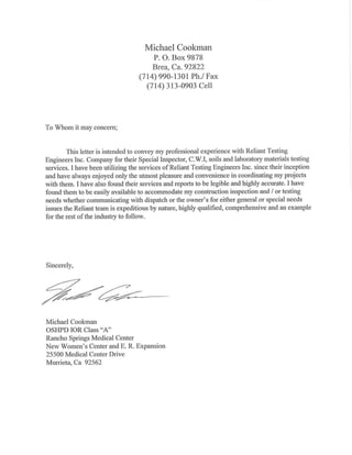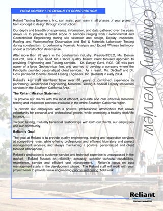 Reliant Testing Engineers provides geotechnical, materials testing, and inspection services throughout all phases of construction projects in Southern California. The company was founded in 2004 by Denise DeGroff and Dr. Sanjay Govil to offer high-quality, client-focused services. Reliant has over 80 employees with extensive experience and offers a wide range of services including geotechnical engineering, construction inspection, non-destructive testing, laboratory testing, and forensic analysis. The company is committed to ensuring projects are completed safely, accurately, and on time and budget.