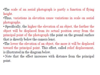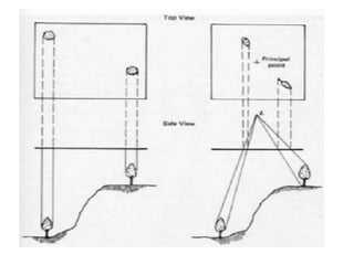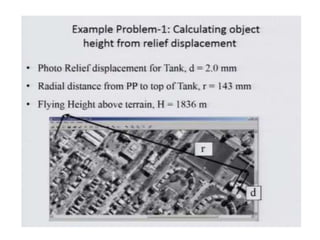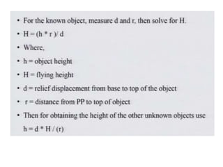 This document discusses methods for calculating the heights of objects like trees and buildings from aerial photos. It describes the relief/radial displacement method, where the displacement between the top and bottom of an object seen in a single aerial photo is used along with the distance from the principal point to determine height. It explains that relief displacement occurs due to perspective projection and varies with object elevation relative to the datum. An example problem demonstrates using measured displacement and distance to calculate an object's height given the flying height.