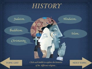 The document explores various aspects of five major world religions: Judaism, Hinduism, Buddhism, Islam, and Christianity, detailing their histories, beliefs, deities, places of worship, religious texts, and festivals. Each religion is described in terms of its origins, key teachings, and significant practices, with emphasized themes of monotheism in Judaism, Islam, and Christianity, and diverse beliefs in Hinduism and Buddhism. Furthermore, the document elaborates on the unique rituals and community practices associated with each faith.