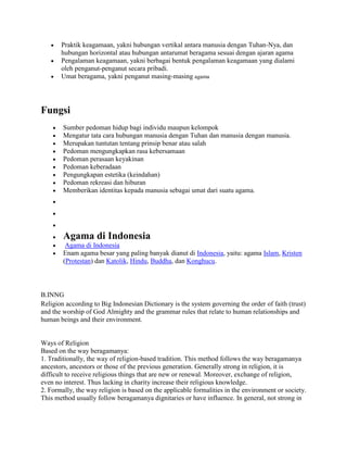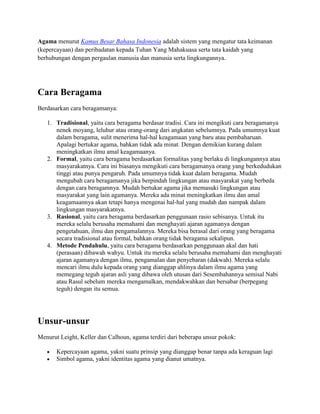 Agama menurut Kamus Besar Bahasa Indonesia adalah sistem yang mengatur keimanan dan peribadatan kepada Tuhan serta tata kaidah dalam interaksi manusia. Terdapat berbagai cara beragama, termasuk tradisional, formal, rasional, dan metode pendahulu, yang mencerminkan kedalaman iman dan pengetahuan penganutnya. Di Indonesia, enam agama utama yang dianut adalah Islam, Kristen, Katolik, Hindu, Buddha, dan Konghucu.