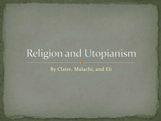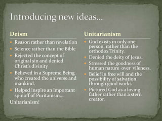 The document summarizes key aspects of several religious movements and utopian communities in the United States between the late 18th and mid-19th centuries. It describes the beliefs and practices of Deism, Unitarianism, Methodism, the Second Great Awakening revivalism, Mormonism, and various utopian communities like the Shakers and the Oneida community. It provides biographical details on influential religious figures like Charles Finney, Joseph Smith, and Brigham Young during this period of religious and social change.