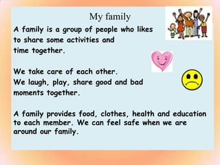 A family is a group of people who enjoy spending time together and taking care of each other. They provide food, clothing, health care, and education for family members. Being with family makes people feel safe.