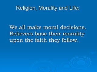 The document discusses how science and technology have influenced various religious topics including animal testing, cloning, fertility treatments, contraception, abortion, transplant surgery, and euthanasia. It provides definitions and perspectives from both religious texts like the Bible and different Christian views on these issues. Key debates discussed include when life begins, the use of animals in research, views on contraception and abortion within and between different Christian denominations, and attitudes towards organ donation and euthanasia/mercy killing.