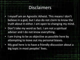 This document summarizes a presentation about discussing Christianity from an agnostic atheist perspective. It outlines arguments for and against theism and atheism. The presentation acknowledges different views on religion and lack thereof, and aims to have a respectful discussion. It also shares the author's perspective of struggling to believe in Christianity due to lack of evidence and issues with the Bible's contents.