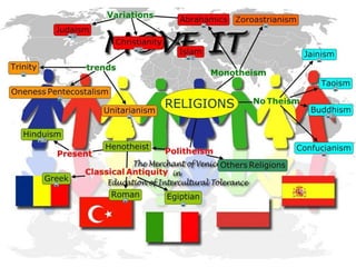 The document provides information about the five largest religions in the world: Christianity, Islam, Hinduism, Buddhism, and Judaism. It gives brief overviews of the origins, beliefs, and number of followers for each religion. Key facts include Christianity and Islam being the two largest with over 2 billion and 1.3 billion followers respectively, Hinduism having the third largest number of followers at 870 million, and Buddhism and Judaism being the fourth and fifth largest religions.