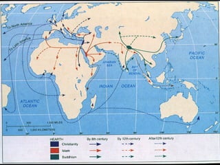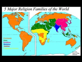 This document provides an overview of key concepts in the study of religion including definitions of religion, major world religions, and philosophical arguments regarding the existence of God. It discusses religion as involving a set of beliefs that provide explanations for human existence and purpose. Major universalizing and ethnic religions are outlined, and key terms like monotheism, polytheism, and secularization are defined. Philosophical arguments for God's existence like the cosmological, teleological, and ontological arguments are summarized. Objections to some arguments are also presented.