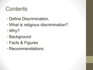Religious discrimination is a serious issue in Pakistan. Minorities are routinely discriminated against by religious authorities and society. The sectarian violence emerged after 1980's Islamization policies that infused education with rigid Islamic content. Statistics show that religious minority groups like Hindus, Christians, and Ahmadis face issues such as discriminatory textbooks, kidnapping and forced conversions of young girls, and targeted attacks by extremists. Recommendations include reviewing education policies to remove discriminatory lessons, protecting religious freedom and rights for all groups, and implementing strict laws against discrimination.