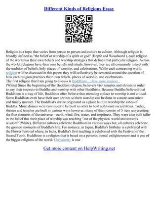The document explores various world religions, emphasizing their unique beliefs, practices, and places of worship. It discusses Buddhism, Christianity, and Judaism, highlighting their rituals, core teachings, and cultural celebrations. Additionally, it addresses the subjective nature of religion and the fundamental characteristics shared among different faiths.