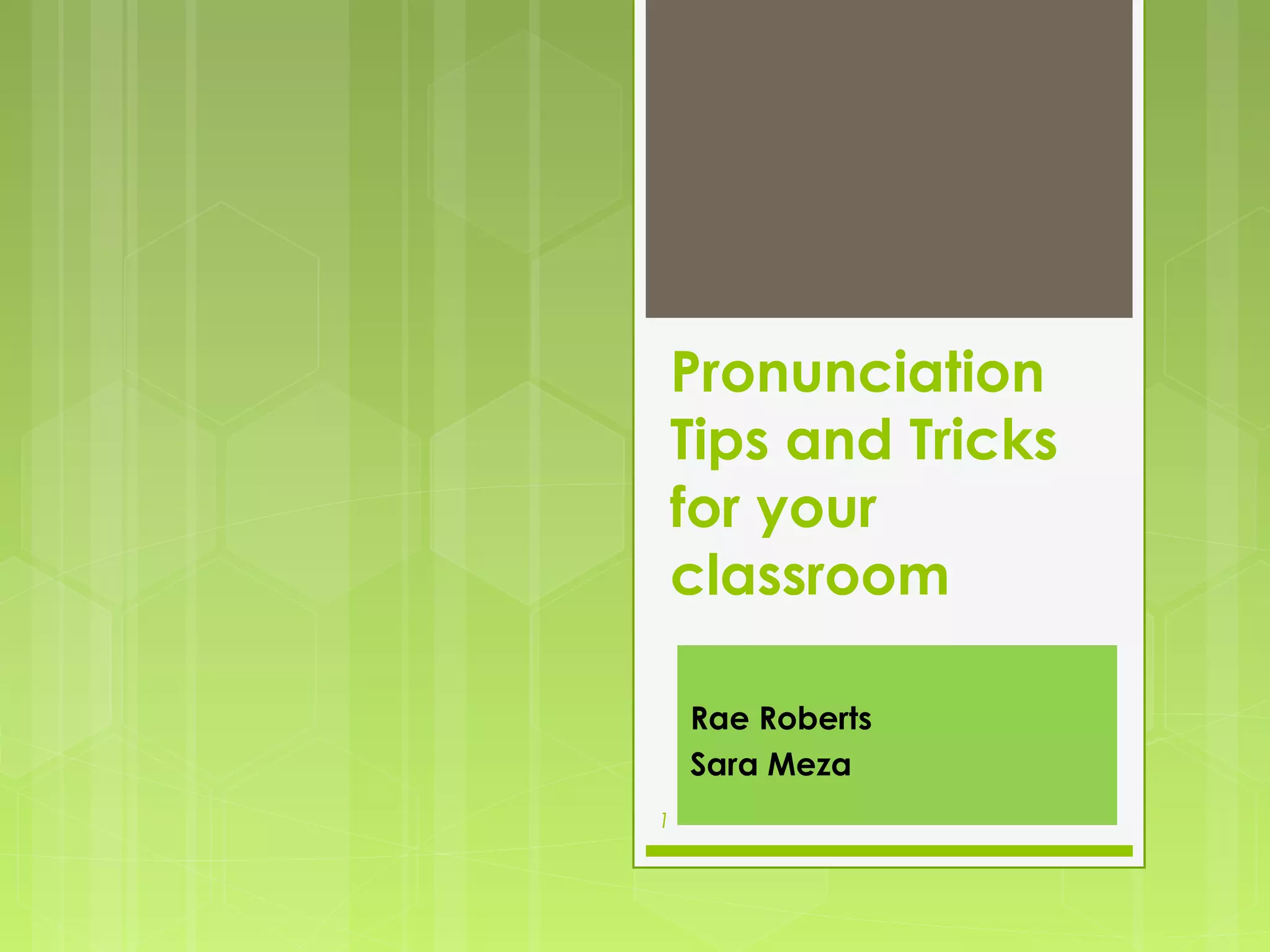 This document provides pronunciation tips and tricks for use in the classroom. It discusses how young children can distinguish sounds in their native language, the importance of pronunciation for comprehension, and strategies for teaching concepts like numbers, verb endings, stress, plurals, and sentence stress through games and activities. Examples and classroom tips are provided throughout to demonstrate effective ways to teach pronunciation. The document concludes by thanking the readers and providing contact information for the authors.