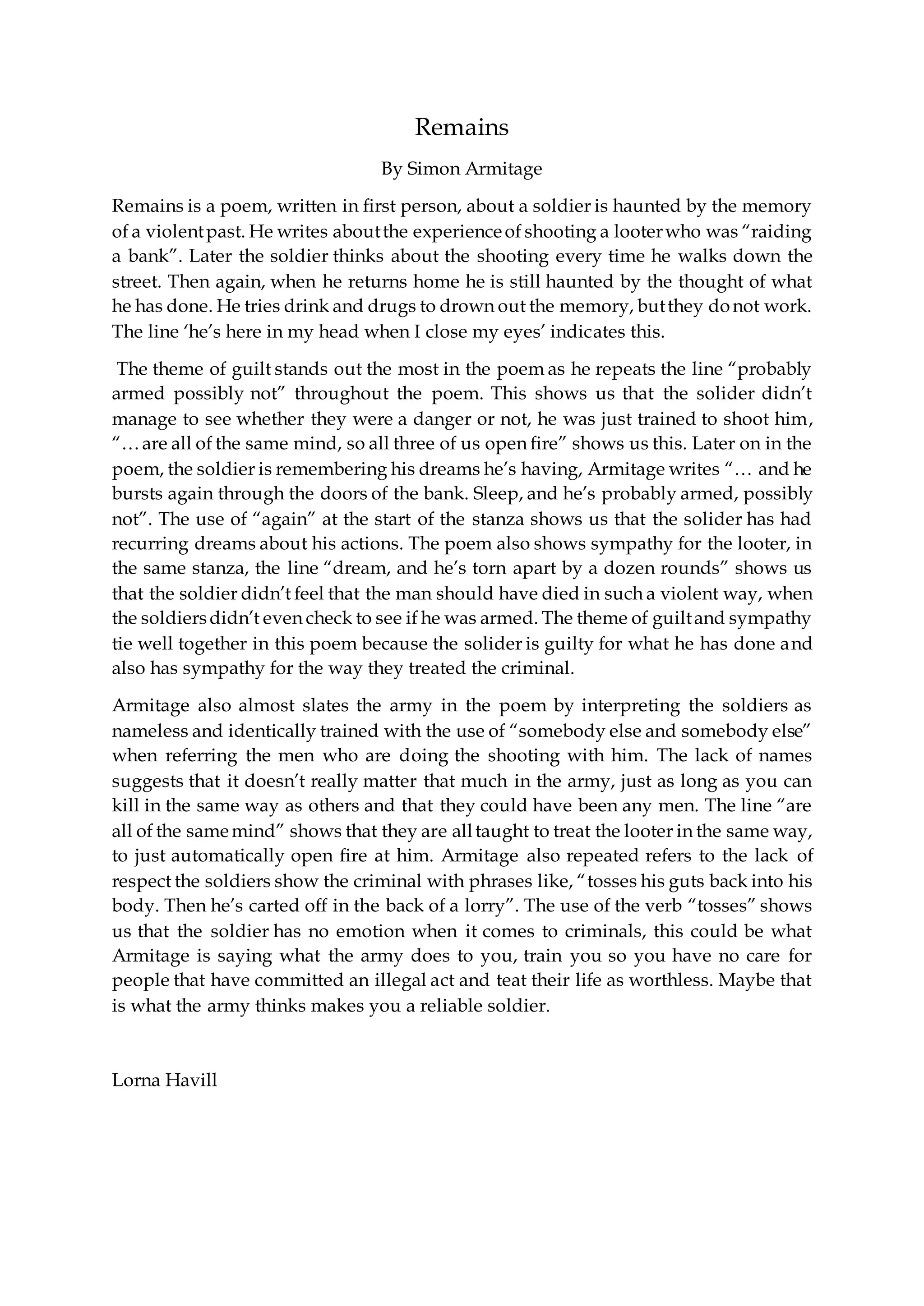 The poem "Remains" by Simon Armitage is written from the perspective of a soldier haunted by the memory of shooting an unarmed looter during a violent past event. The soldier thinks back to shooting the looter every time he walks down the street or tries to sleep. Drinking and drugs do not help drown out the memory. The soldier feels guilt because he did not check if the looter was armed before opening fire along with two other soldiers. The soldier has recurring dreams of the shooting. The poem conveys sympathy for the looter and guilt felt by the soldier. It also criticizes the army for training soldiers to shoot without determining threats and to disregard the lives and dignity of criminals.