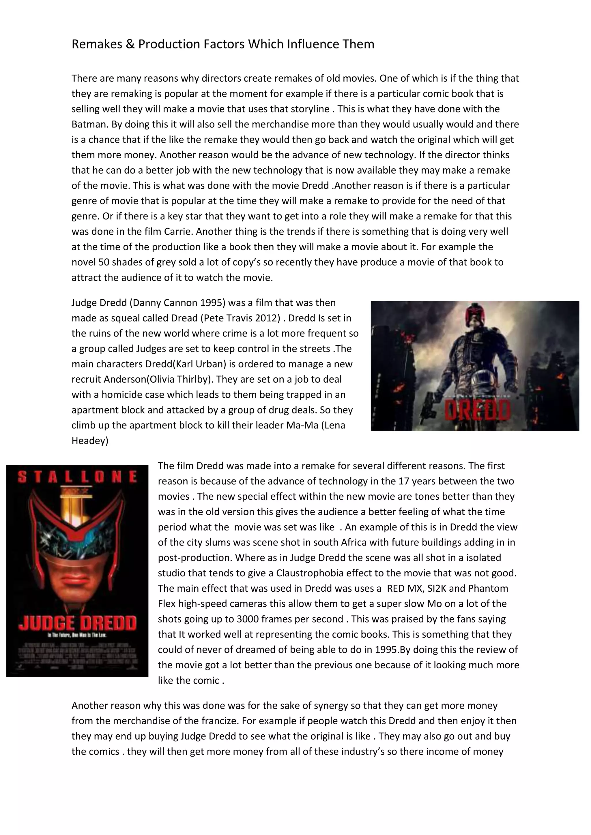 The document discusses several reasons why directors create remakes of old movies. One reason is to capitalize on existing popular franchises or genres that will attract audiences. Another is to take advantage of new technologies to improve special effects or better represent the original work. Additionally, remakes allow studios to profit from multiple releases of the same property through synergies across production, distribution, and merchandising channels. Horizontal integration of production and distribution companies enables studios to profit from both original and remake versions. Social and political contexts may also influence which works are remade to better resonate with contemporary audiences. Overall, the primary motivation for remakes is the potential for increased financial returns through existing brand recognition and expanded monetization opportunities.