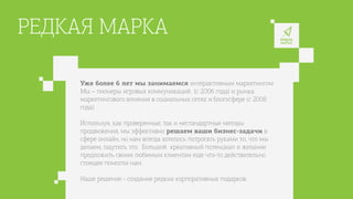Компания 'Редкие подарки' более 6 лет занимается интерактивным маркетингом и разработкой оригинальных корпоративных подарков, предлагая креативные решения для бизнеса. Они предлагают уникальные подарки, такие как золочёные ручки и креативные игры, которые помогают клиентам проявить индивидуальность в поздравлениях. Основная идея компании заключается в том, чтобы вдохновить клиентов быть оригинальными и принимать участие в создании уникальных подарков.
