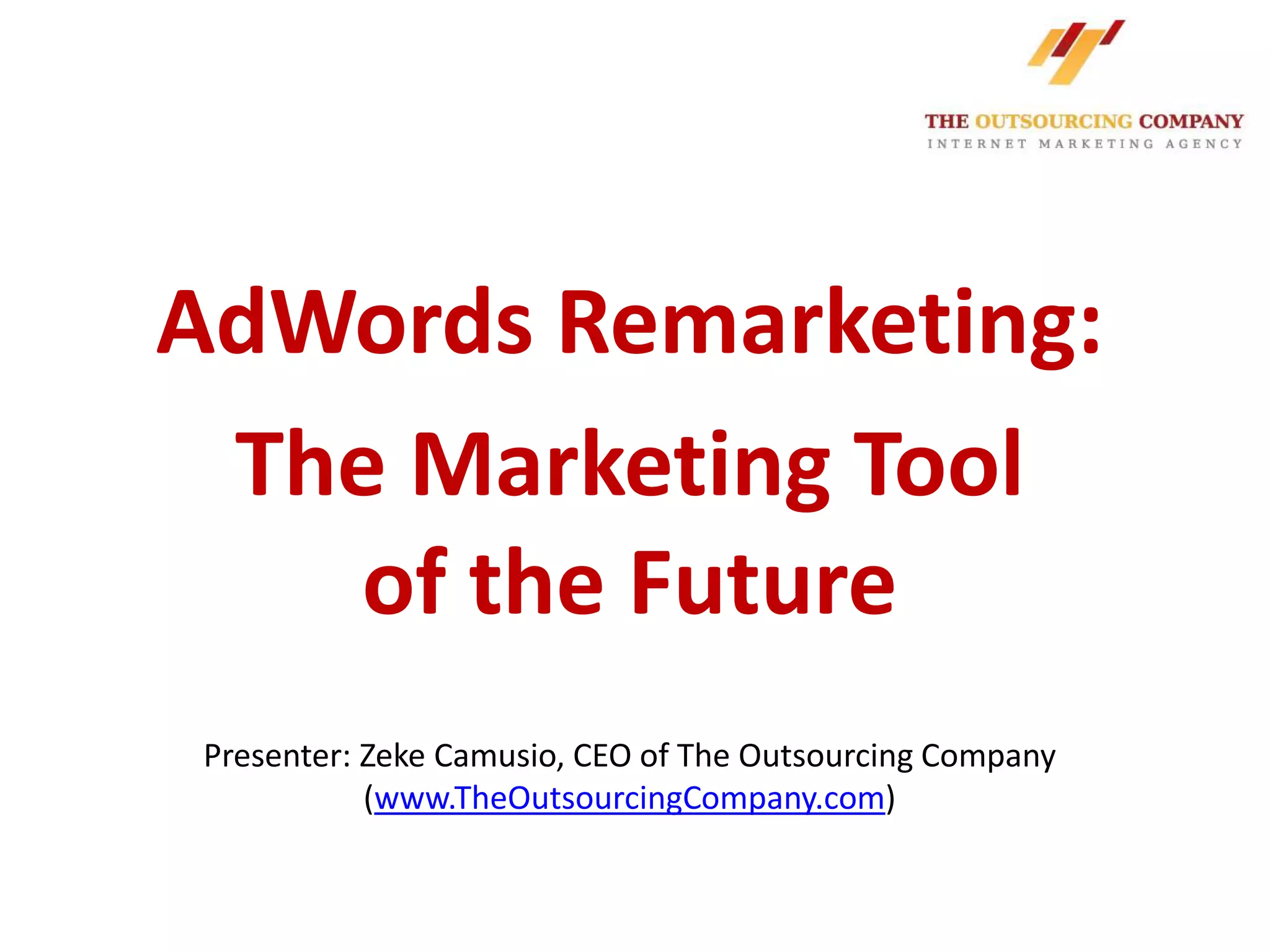 The document is a presentation about AdWords remarketing by Zeke Camusio, CEO of The Outsourcing Company. It discusses how remarketing works, how to set up remarketing lists in Google Ads, how to create custom remarketing combinations, and how to integrate remarketing with Facebook and LinkedIn advertising. The presentation includes slides explaining these key aspects of remarketing and examples of different types of remarketing lists and audiences.