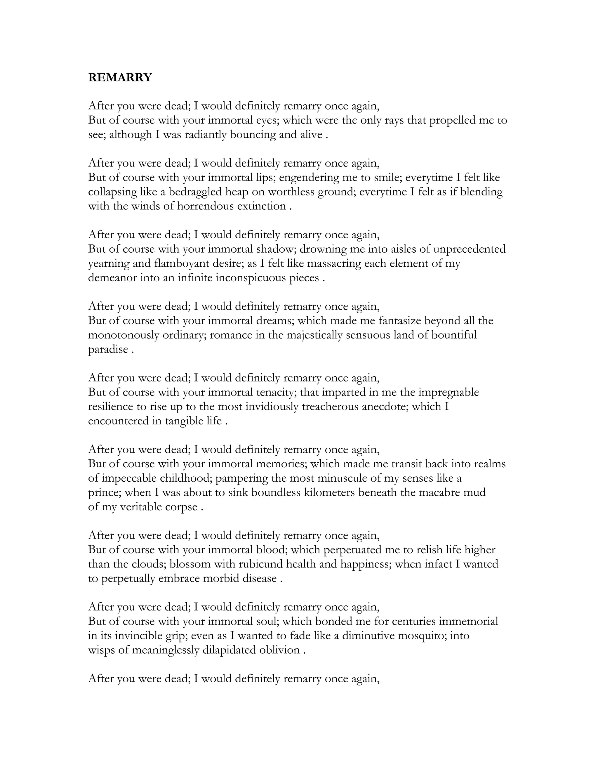 The document expresses that after a person's death, the speaker would remarry but only if they could bring aspects of the deceased with them. In multiple stanzas, the speaker discusses remarrying with the deceased's immortal eyes, lips, shadow, dreams, tenacity, memories, blood, soul, breath, and heart. Each immortal aspect is said to have kept the speaker alive, given them resilience, transported them to childhood, allowed them to flourish, bonded them for centuries, empowered them to lead fulfilling lives, and enabled them to help humanity.