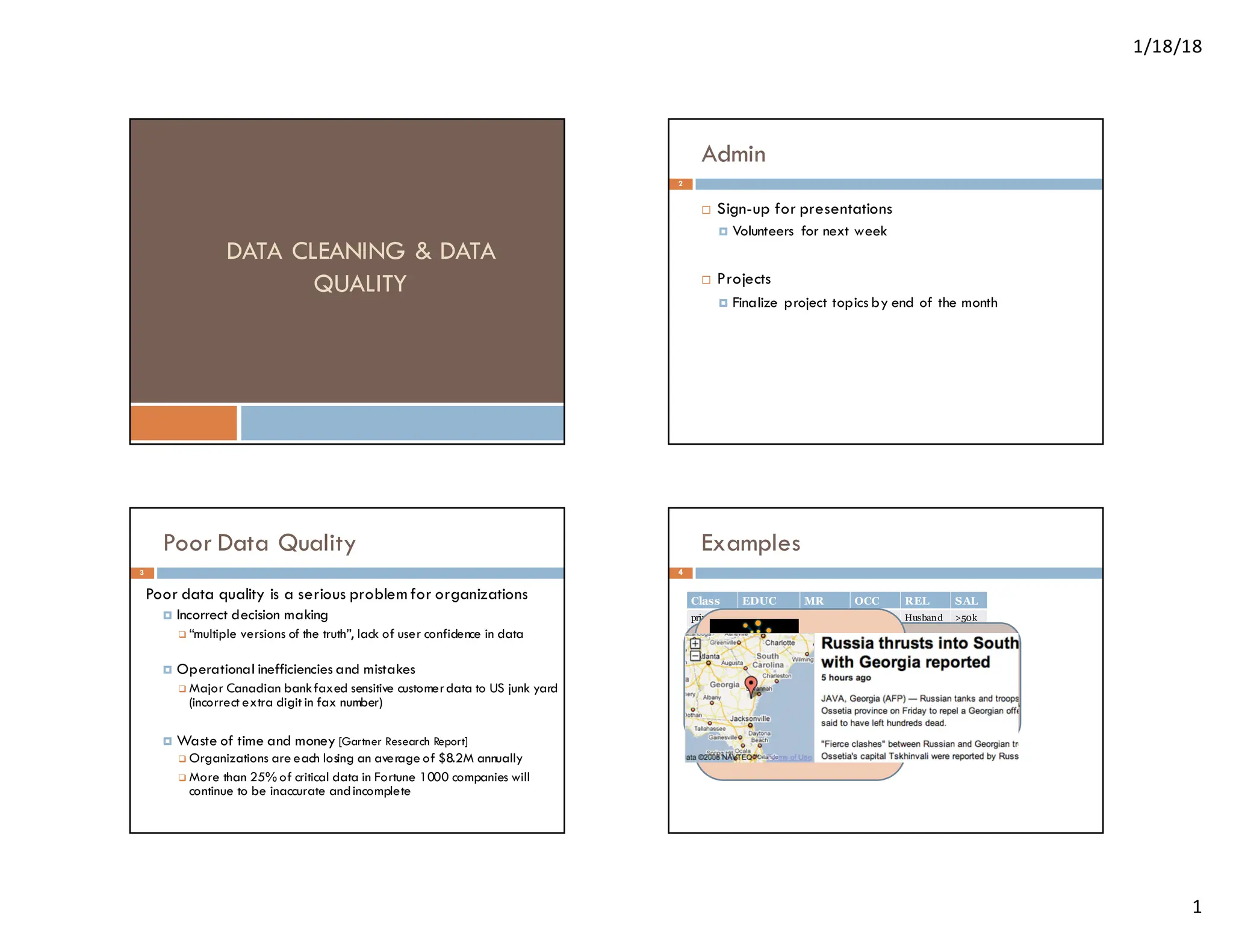 The document discusses the critical issues surrounding poor data quality, including its financial impacts on organizations and the common causes of inconsistencies, such as human error and weak enforcement of constraints. It highlights the importance of integrity constraints in maintaining data accuracy and outlines steps for data cleaning. Additionally, it includes anecdotes on various data quality failures and offers advice on data presentation and project planning for improving data management.