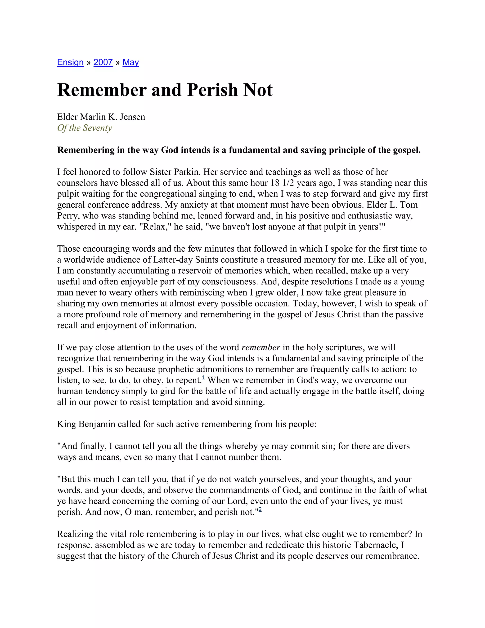 3) President Hinckley emphasizes the past to help us live righteously now and see God's hand in our history and future. Remembering enables a connection to our spiritual heritage and motivation to greater service.