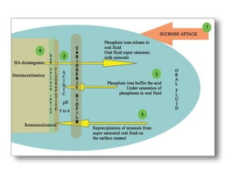 This document discusses various techniques and materials for minimal intervention dentistry and remineralization. It describes the Atraumatic Restorative Technique (ART) which removes decay using hand instruments and restores cavities with adhesive materials. Glass ionomer cements are effective restorative materials for ART due to their fluoride release and adhesion properties. Remineralization involves rebuilding demineralized tooth structure using agents like fluoride and casein phosphopeptide-amorphous calcium phosphate (CPP-ACP) which provide calcium, phosphate, and fluoride ions to remineralize enamel. Newer remineralizing systems and delivery methods like dentifrices, sealants, and restorative materials are also discussed.