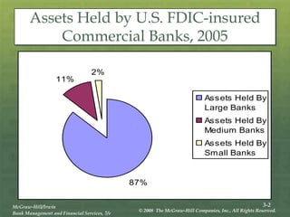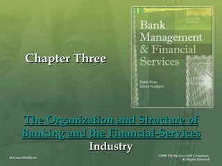 The document provides an overview of the structure and organization of banks in the U.S. and international banking systems, detailing categories such as community banks, money center banks, unit banks, and branch banks. It highlights trends in bank classifications, branching growth, and the establishment of bank holding companies, along with their advantages and challenges. Furthermore, it discusses regulatory frameworks affecting banking, including the Riegle-Neal Act and the concept of financial holding companies, as well as the efficiency of banking operations and goals in corporate governance.