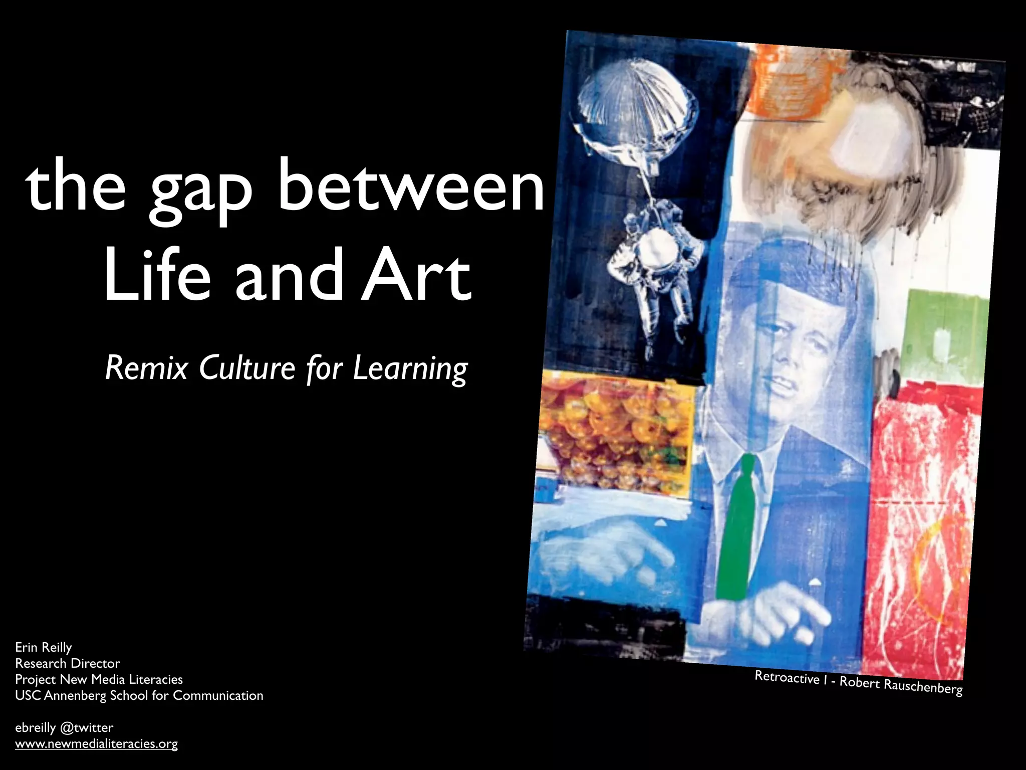 The document discusses the concept of remix culture in learning, highlighting that many online teens engage in remixing content for creative purposes. It outlines various new media literacy skills and challenges designed to enhance their understanding and practice of media creation. Additionally, it provides resources and activities to facilitate participation in this evolving landscape of media production and appropriation.