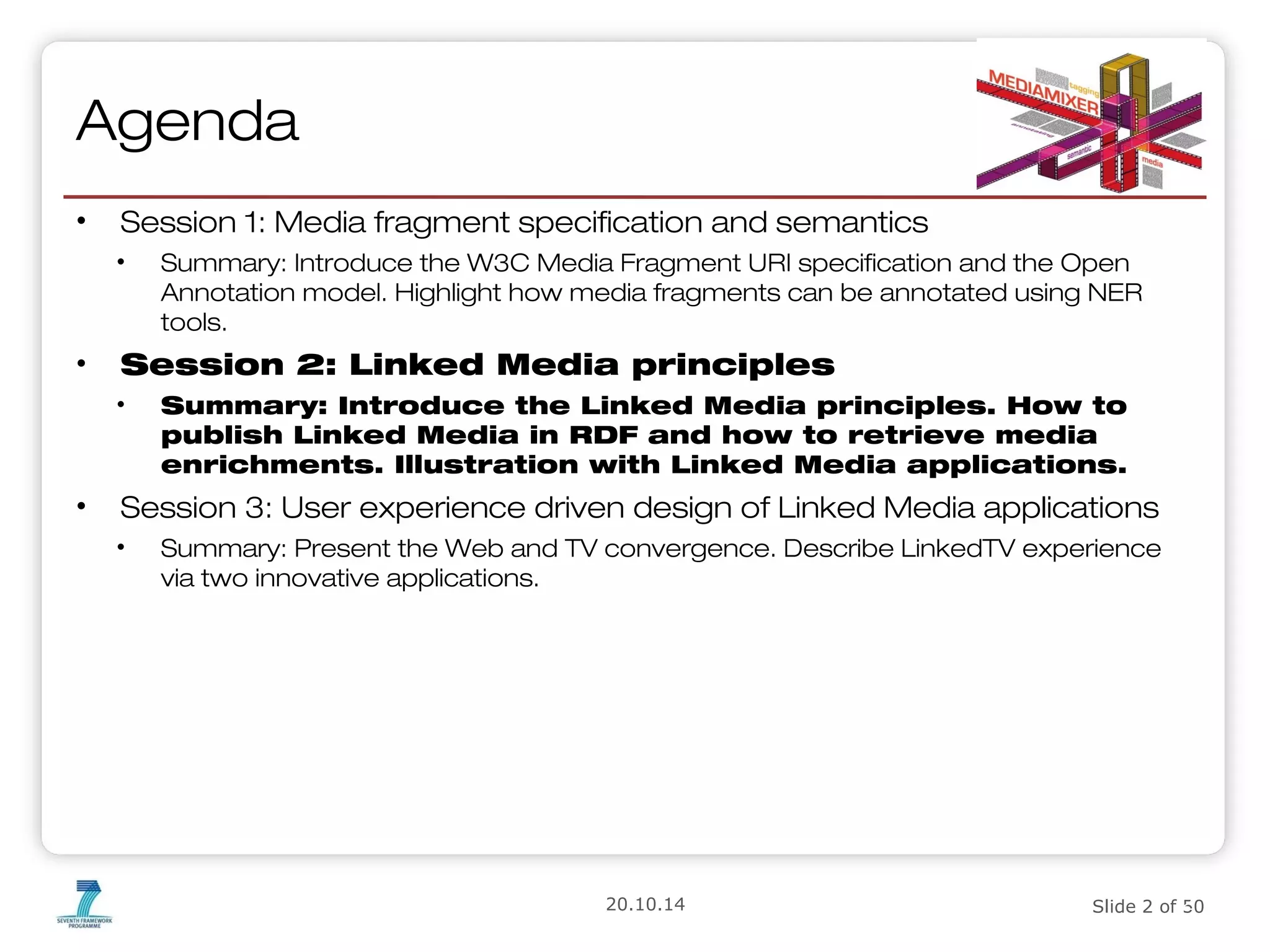 The document outlines a tutorial on linked media, focusing on its principles, retrieval, and user experience, tailored for the semantic web. It includes discussions on media fragments, linkedtv applications, and the integration of semantic technologies with online media, emphasizing the importance of common representations and annotations. Various examples demonstrate how linked media can be enriched and accessed through SPARQL queries and other linked data technologies.