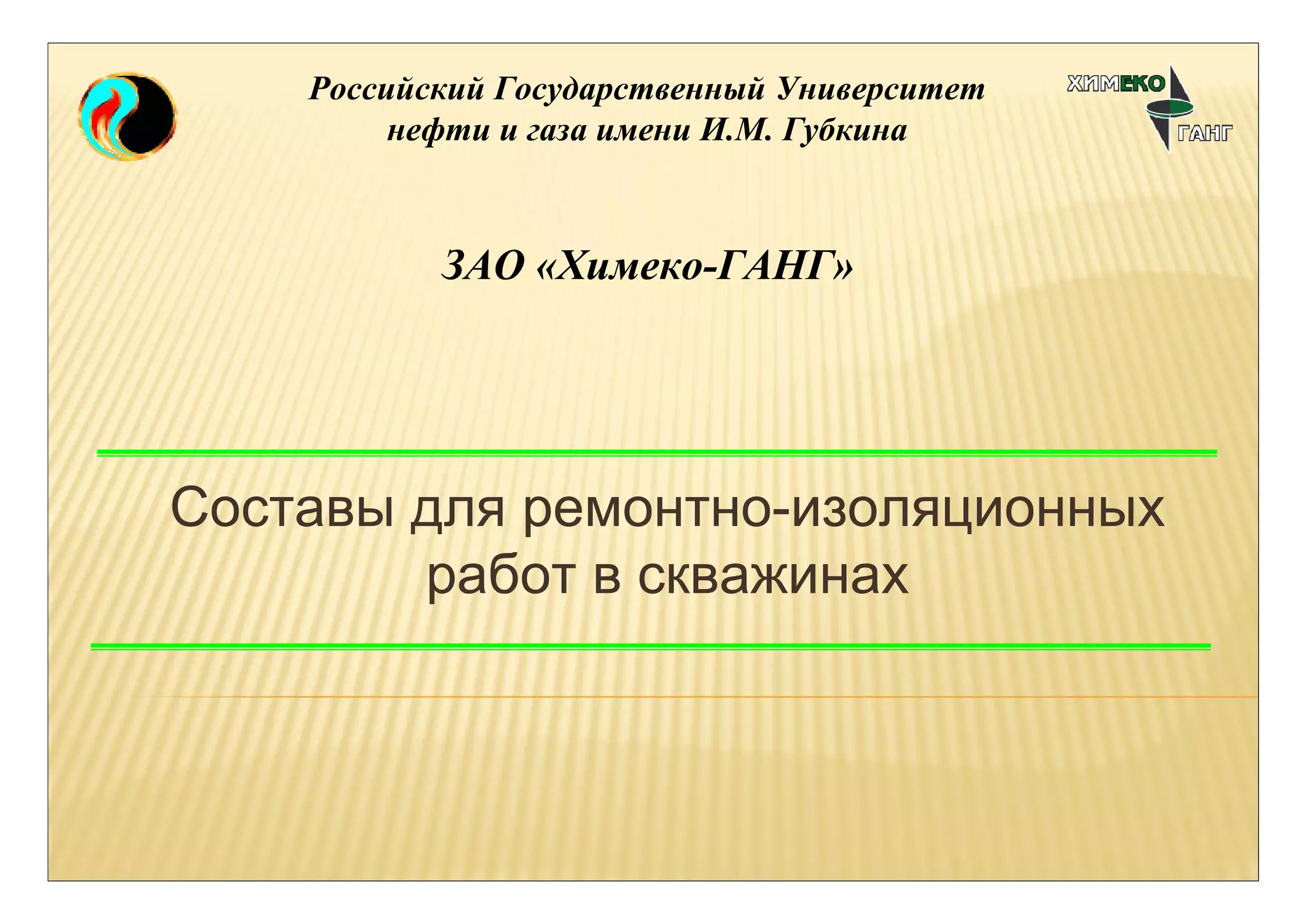 Документ описывает проблемы и решения, связанные с обводнением скважин в нефтедобыче в России, где на одну тонну нефти приходится 7-10 тонн попутной воды. Основное внимание уделяется составам для ремонтно-изоляционных работ, включая различные технологии и химические растворы, используемые для водоизоляции и ликвидации негерметичностей. Также представлены преимущества и применение разных типов цементных и гелеобразующих составов, а также контактная информация для более детального обсуждения.