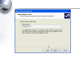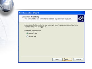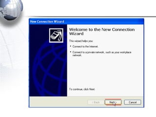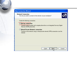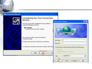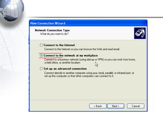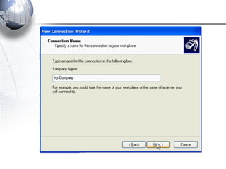 This document discusses remote access connections and virtual private networks (VPNs). It provides contact information for Ah. Fawad 'Saiq' and describes dial-up and broadband internet access. It also discusses remote client access via VPN, VPN protocols, authentication protocols like PAP and CHAP, and inbound connections.