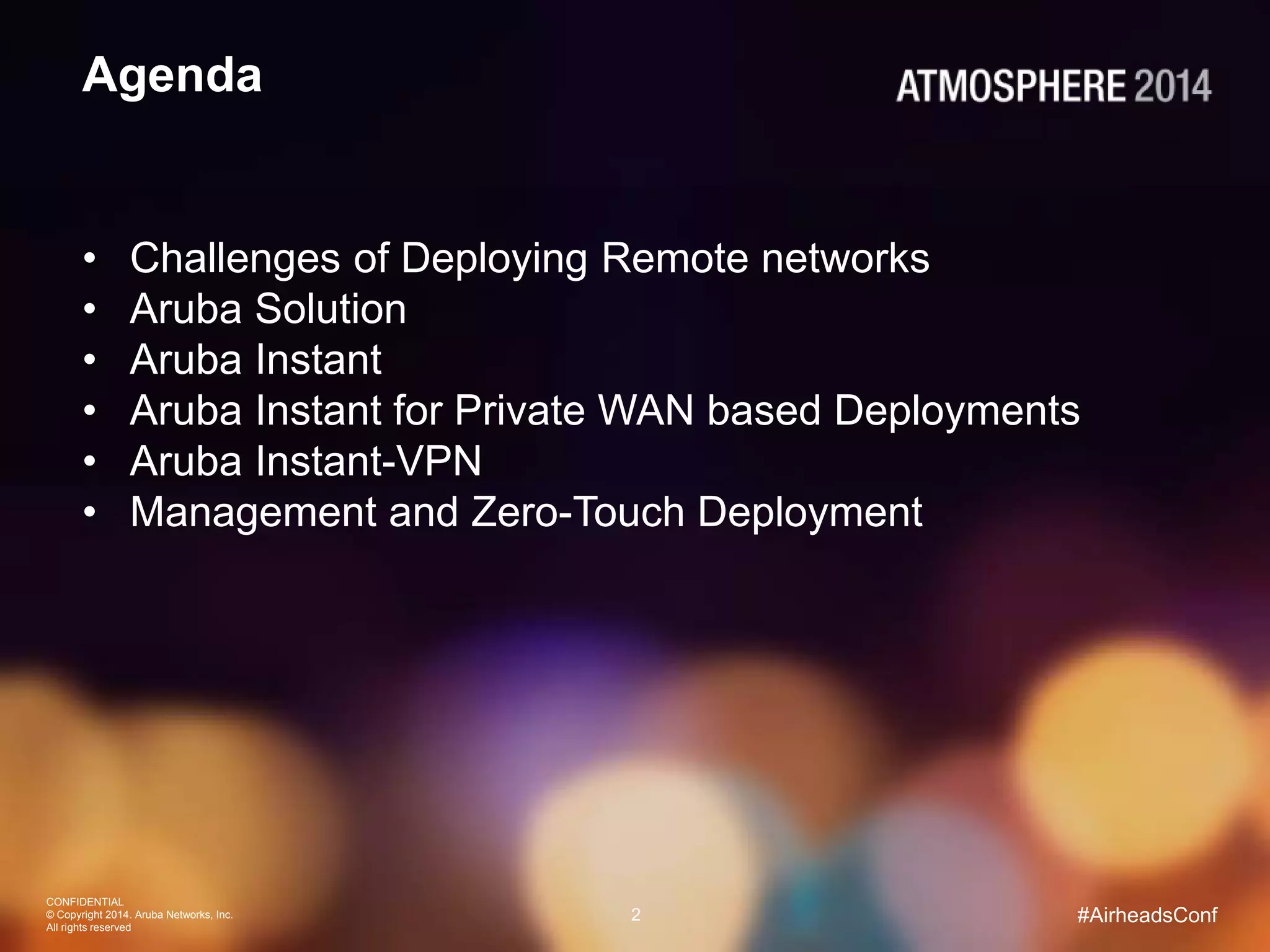 The document discusses Aruba's solutions for deploying remote and branch networks. It covers the challenges of deploying remote networks, Aruba Instant for private WAN deployments, Aruba Instant-VPN, and management and zero-touch deployment. Aruba Instant provides scalable, self-optimizing, and self-healing wireless access for remote offices and branches. Aruba Instant-VPN allows secure connectivity over the WAN for remote networks using IPsec VPN tunnels. Management tools like AirWave and Aruba Central enable centralized monitoring and zero-touch provisioning of remote network devices.