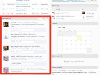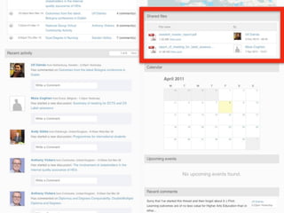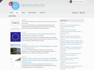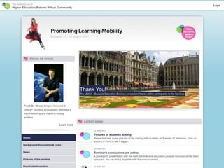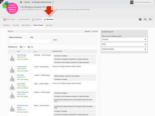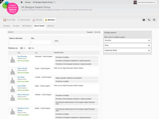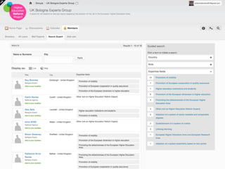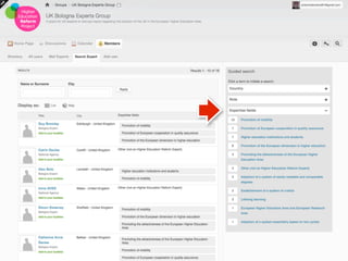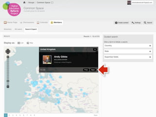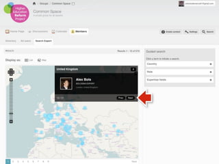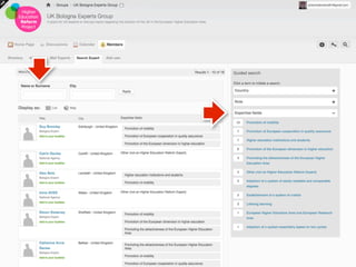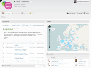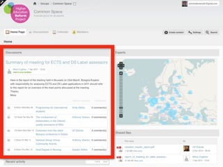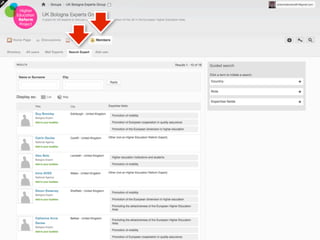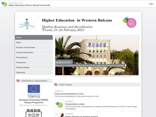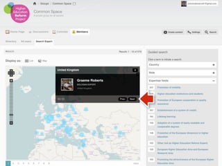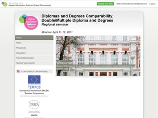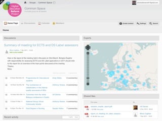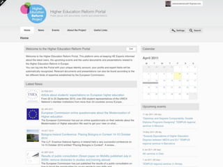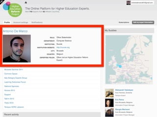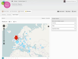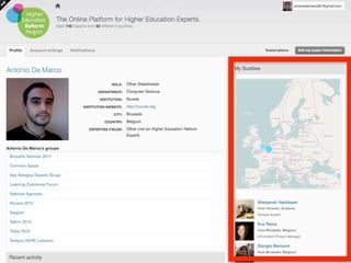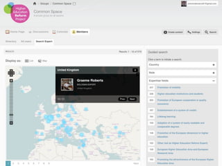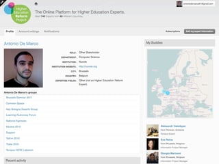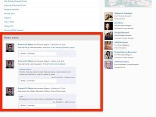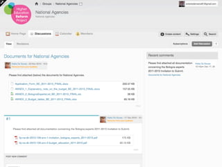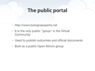The document discusses a collaborative project involving remote collaboration and the use of Drupal and Open Atrium to support higher education reforms in Europe. It outlines the roles of various educational networks and programs, including Unica, Tempus, and Bologna experts, in fostering inter-university cooperation and facilitating communication among stakeholders. Key initiatives include training seminars, regional workshops, and conferences, all aimed at improving higher education quality and integration across Europe.