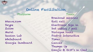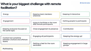 The document outlines best practices for remote facilitation by Dana Pylayeva and Kriti Jaising, emphasizing the importance of connection, engagement, and effective communication in virtual meetings. Key recommendations include using cameras to enhance interaction, keeping groups small for discussions, and allowing adequate time for activities. Participants are encouraged to engage actively and utilize tools that foster collaboration and psychological safety in remote environments.