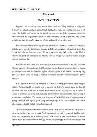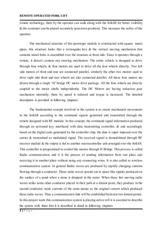 This document describes a remote operated forklift. It discusses how the forklift is operated through a remote control unit that uses radio frequency signals and microcontrollers to control the forklift's motors and movements. The forklift uses DC motors coupled to gears and chains to convert rotational motion to linear motion for lifting and lowering the forks, as well as driving the forklift in all directions. Safety protocols for operating forklifts are also mentioned.