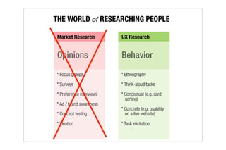The document discusses remote user research tools and techniques, focusing on both moderated and unmoderated remote studies. It provides examples of tools for remote moderated research like GoToMeeting as well as unmoderated automated tools like Usabilla. The presenters provide advice on best practices for remote user research including recruiting, study design, note taking, and overcoming challenges with remote methods.