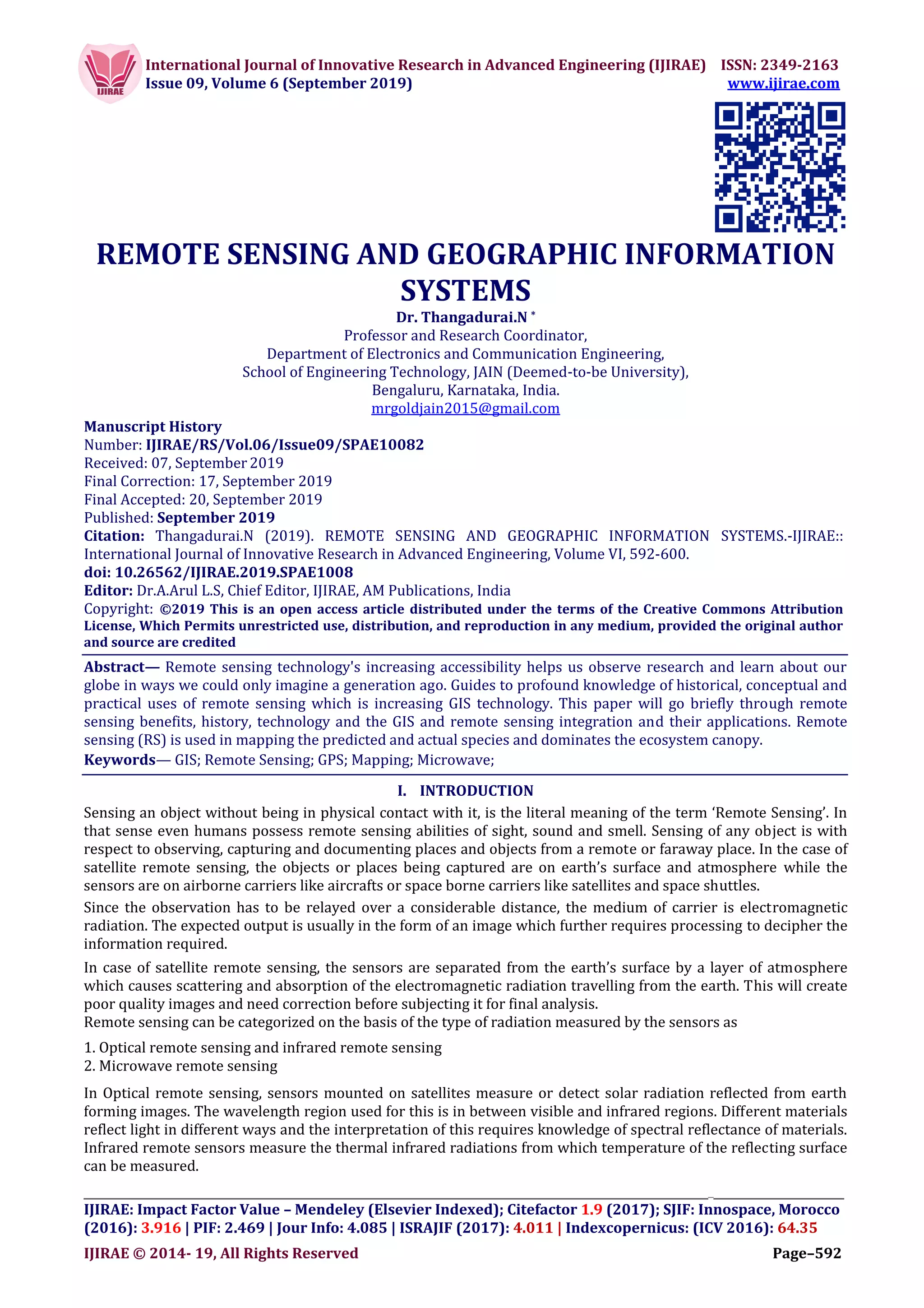 The document discusses the advancements in remote sensing and geographic information systems (GIS) and their applications across various fields such as agriculture, civil engineering, and environmental monitoring. It highlights the types of remote sensing technologies, including optical, infrared, and microwave methods, along with their benefits and integration into GIS for improved data analysis. Lastly, it outlines the significance of GPS in providing precise location data for enhanced mapping and analysis in these applications.