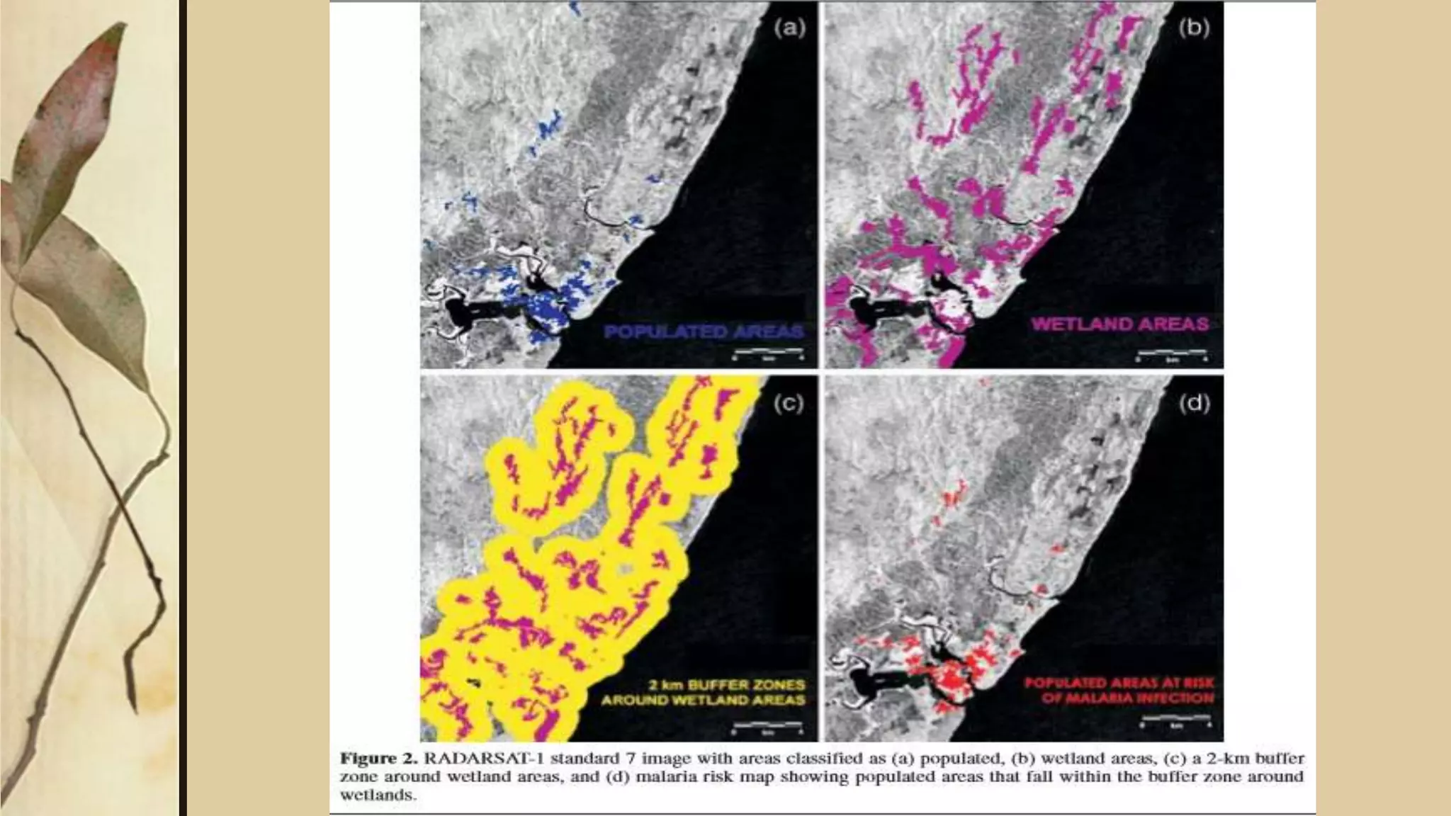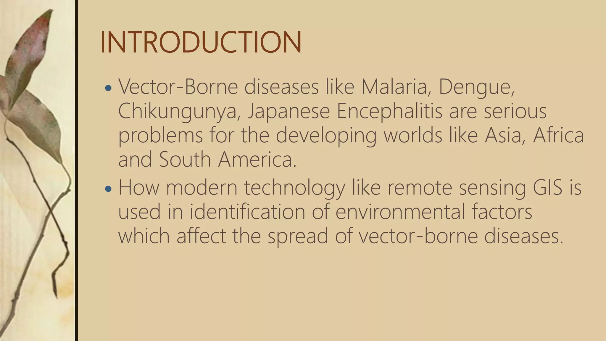 This document discusses using remote sensing and GIS technologies to monitor vector-borne diseases. Specifically, it aims to determine how environmental factors like temperature, rainfall, humidity, forest cover, and water bodies affect disease occurrence. The methodology includes using regression analysis and geostatistical approaches to produce risk maps for predicting and controlling diseases. Remote sensing images and meteorological data are analyzed in GIS to map high, medium, and low risk areas. Radar images offer advantages for this type of analysis as they can image landscapes day or night, through clouds and haze. The results demonstrate how these tools can effectively model disease transmission and promote public health planning.