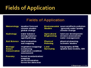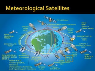 This document discusses remote sensing and meteorology. It defines remote sensing as obtaining information about physical objects through non-contact sensors. Meteorology is the study of atmospheric phenomena like weather. Meteorological satellites and weather radars are important tools for monitoring weather. Satellites provide global coverage of cloud patterns and weather systems from space. They capture visible, infrared, and water vapor images to study cloud formations, temperatures, and moisture in the atmosphere. Radar emits microwaves that bounce off water droplets in clouds to measure precipitation and cloud locations. Satellite weather monitoring improves forecasts, especially over oceans with sparse weather station data.