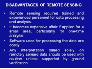 Remote sensing is the science of obtaining information about the Earth's surface without direct contact, utilizing energy reflected or emitted from objects. This technology employs both passive and active sensors to analyze various forms of electromagnetic energy and has applications in civil engineering, agriculture, environment, and disaster management. Remote sensing offers extensive data coverage and efficient data acquisition over inaccessible areas, enabling informed decision-making in numerous fields.