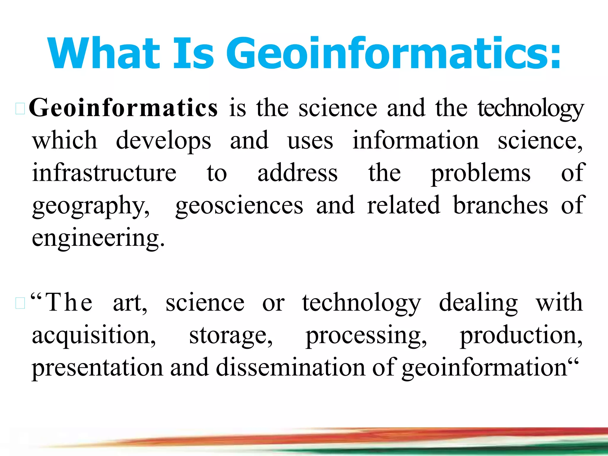 Geoinformatics is the science and technology dealing with geographic information and related data. It involves acquiring, storing, processing, analyzing and disseminating geospatial data. Key branches of geoinformatics include remote sensing, geographic information systems, cartography, global navigation satellite systems, photogrammetry and database management systems. Remote sensing uses sensors on platforms like satellites and aircraft to collect imagery and geospatial data of the Earth without direct contact.