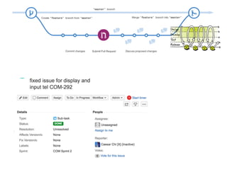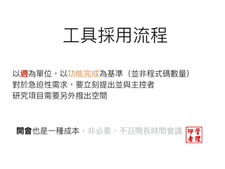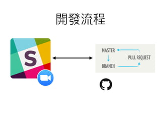 The document discusses various aspects of agile project management, including product planning and communication tools like Slack, Zoom, and Google Docs. It mentions different workflows such as remote and face-to-face meetings, along with coding conventions and task management tips. Resources and links to GitHub and Facebook are provided for further reference.