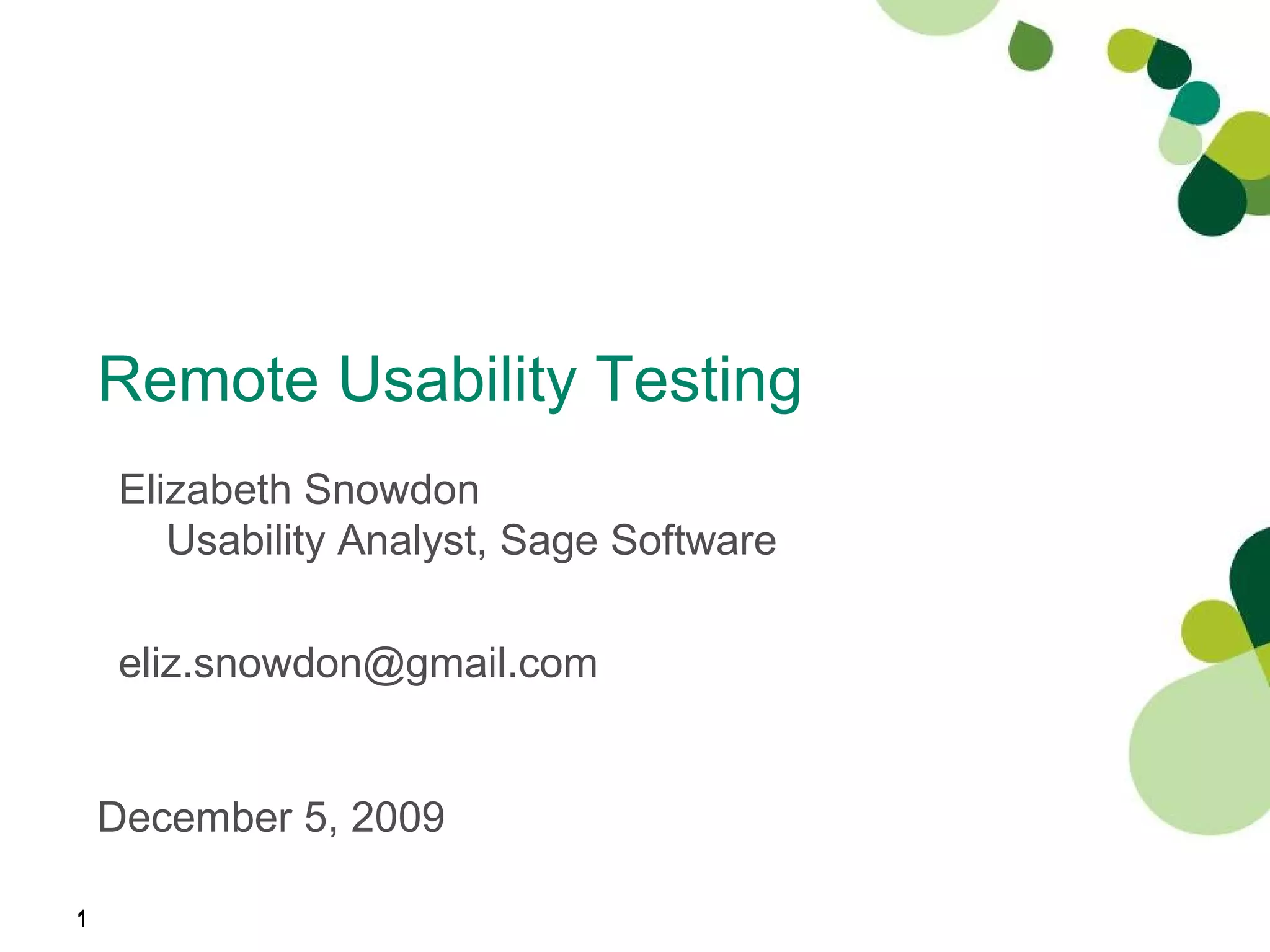 Elizabeth Snowdon is a senior usability analyst at Sage Software who has been conducting usability studies since 2003. She discusses remote usability testing, which involves testing sessions where the participant and moderator are not physically in the same place but communicate electronically. Some advantages of remote testing are that it expands recruitment populations, saves costs compared to in-person lab testing, and allows testing in users' natural environments. However, remote testing has disadvantages like not being able to see participants' screens and potential technical issues. Snowdon provides an example case study where remote testing saved $50,000 compared to in-lab testing.
