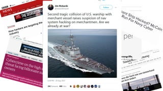 The document discusses vulnerabilities in maritime technology, particularly targeting yachts and ships, emphasizing the risks of satellite communication and internet access from these vessels. It outlines various attack vectors including GPS spoofing and remote access to critical systems like autopilot and engine controls. The presentation also highlights the growing importance of security research in the context of autonomous ships and smart maritime technology.