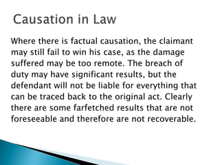 - Causation in law requires that damage be both factually caused by the defendant's actions, as well as not being too remote or unforeseeable.