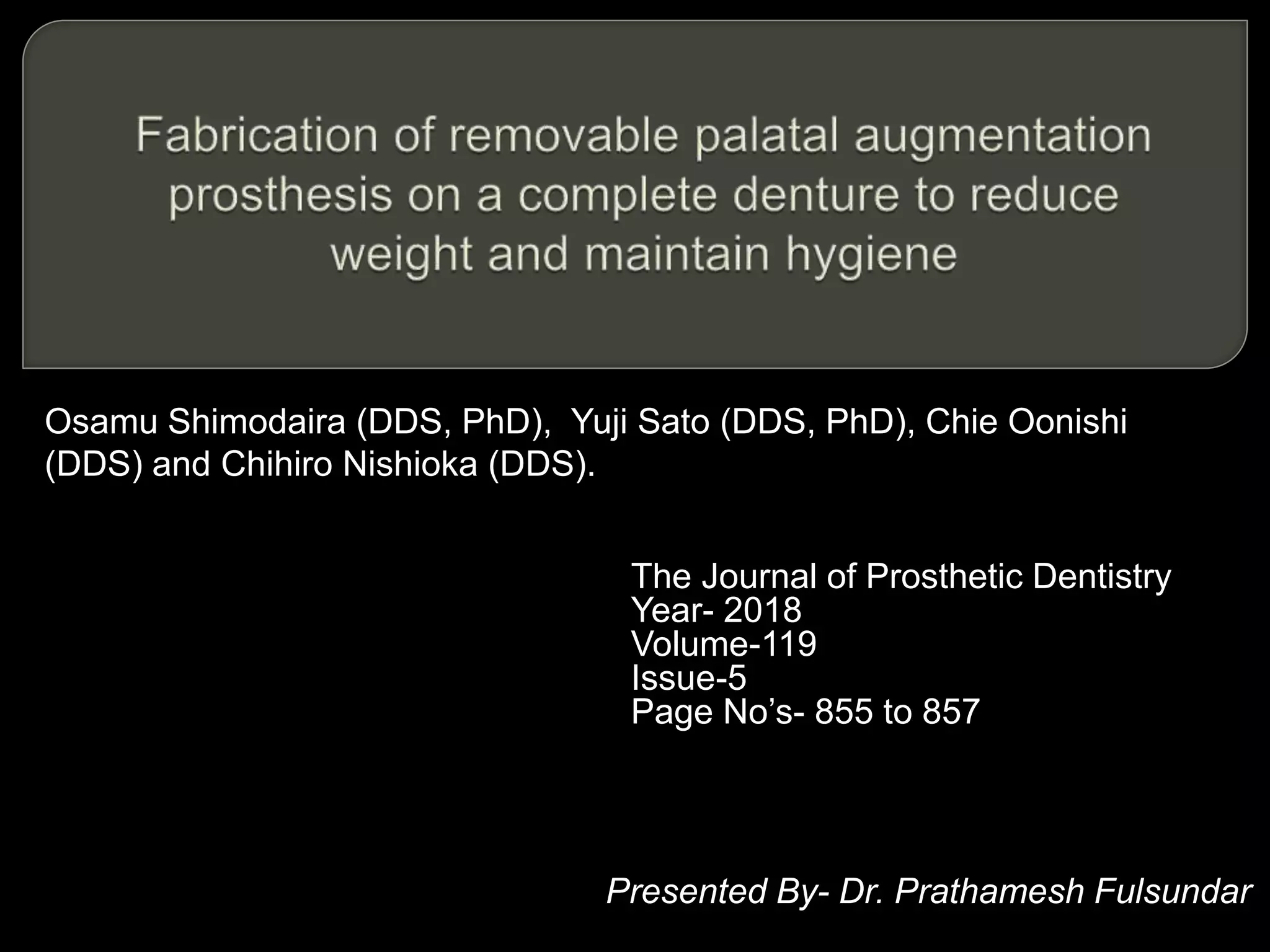 The document discusses a removable maxillofacial prosthesis designed to enhance tongue/palate contact, aiding individuals with swallowing and speech difficulties due to conditions such as stroke and neurological deficits. It highlights a methodology for fabricating a lightweight palatal augmentation prosthesis (PAP) while maintaining hygiene by using a removable veneer-type design. Clinical outcomes indicate significant weight reduction and effective functionality, affirming the technique's potential for improving the quality of life for affected patients.