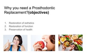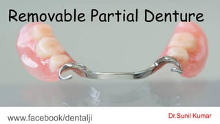 This document discusses removable partial dentures (RPDs). It defines RPDs as any prosthesis that replaces some teeth in a partially dentate arch and can be removed by the patient. There are two main types of RPDs: acrylic partial dentures made of acrylic and clasp, and cast partial dentures made of cast metal and acrylic. Kennedy's classification system is described which categorizes different types of edentulous arches. Applegate rules provide additional guidelines for Kennedy's classification. Examples of terminology used in relation to RPDs are also given such as abutment, retainer, and distal extension base. Social media links are provided at the end for additional dental education resources.