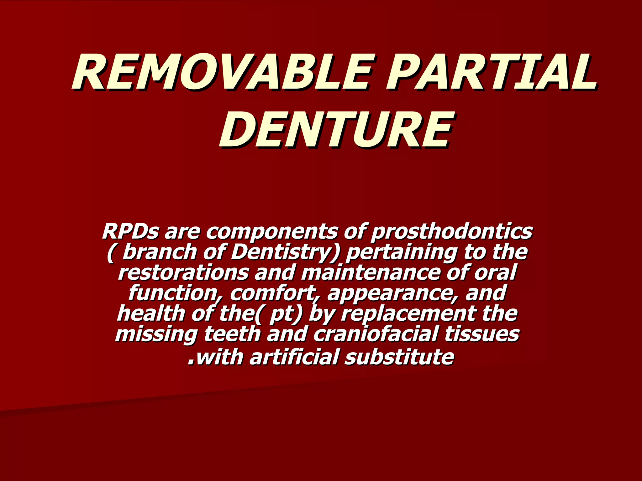 This document discusses removable partial dentures (RPDs). It describes the objectives of prosthodontic treatment, consequences of tooth loss, components and classification of RPDs, principles of design including support, retention and stability, and types of major connectors and retainers. The Kennedy classification system and Applegate's rules for applying it are also summarized.