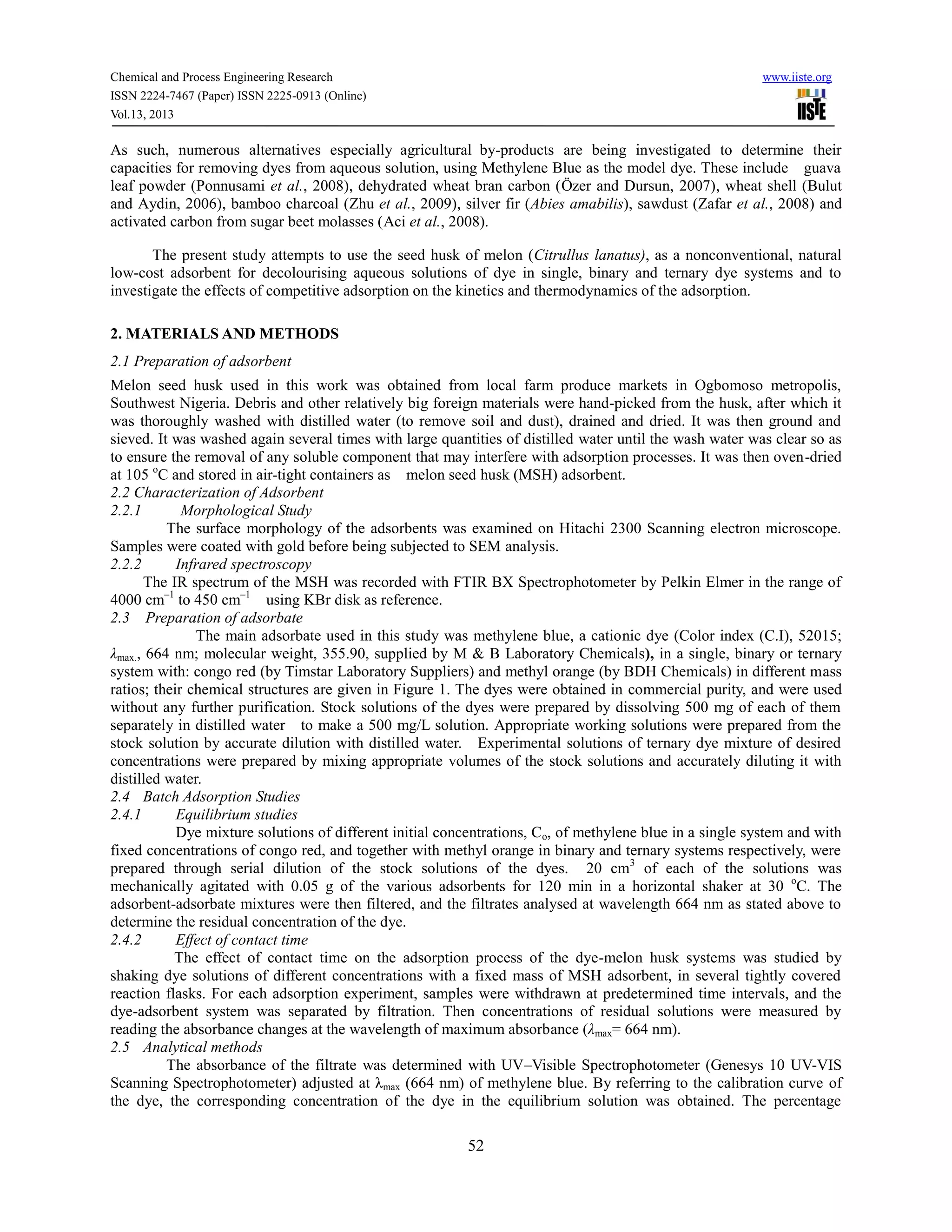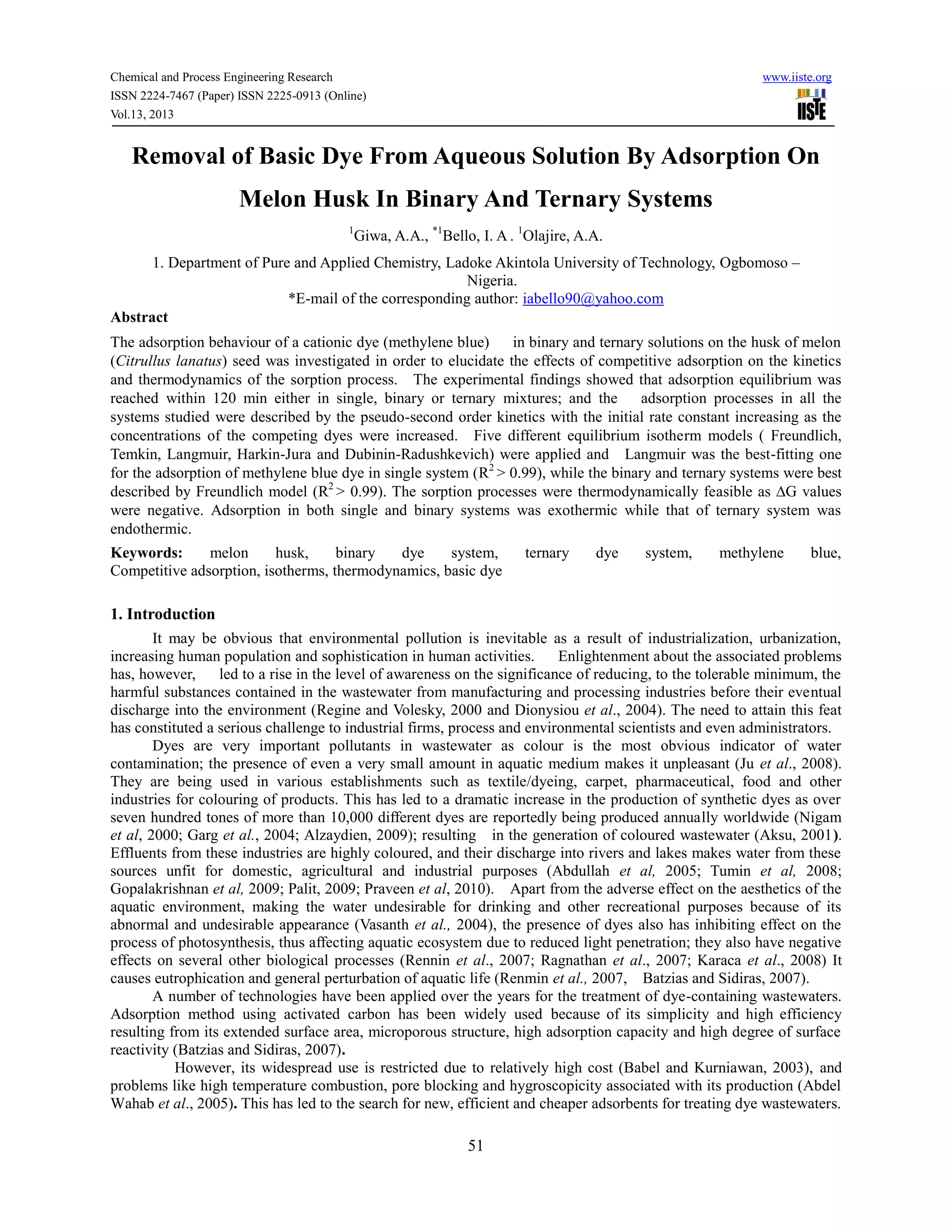 This document discusses a study that investigated the adsorption behavior of the cationic dye methylene blue in single, binary, and ternary solutions using melon husk as an adsorbent. Experiments showed that adsorption equilibrium was reached within 120 minutes for all systems. Kinetic data fit best to a pseudo-second order model. Isotherm data fit best to the Langmuir model for single systems and Freundlich model for binary and ternary systems. Adsorption was found to be thermodynamically feasible and exothermic for single and binary systems but endothermic for ternary systems.