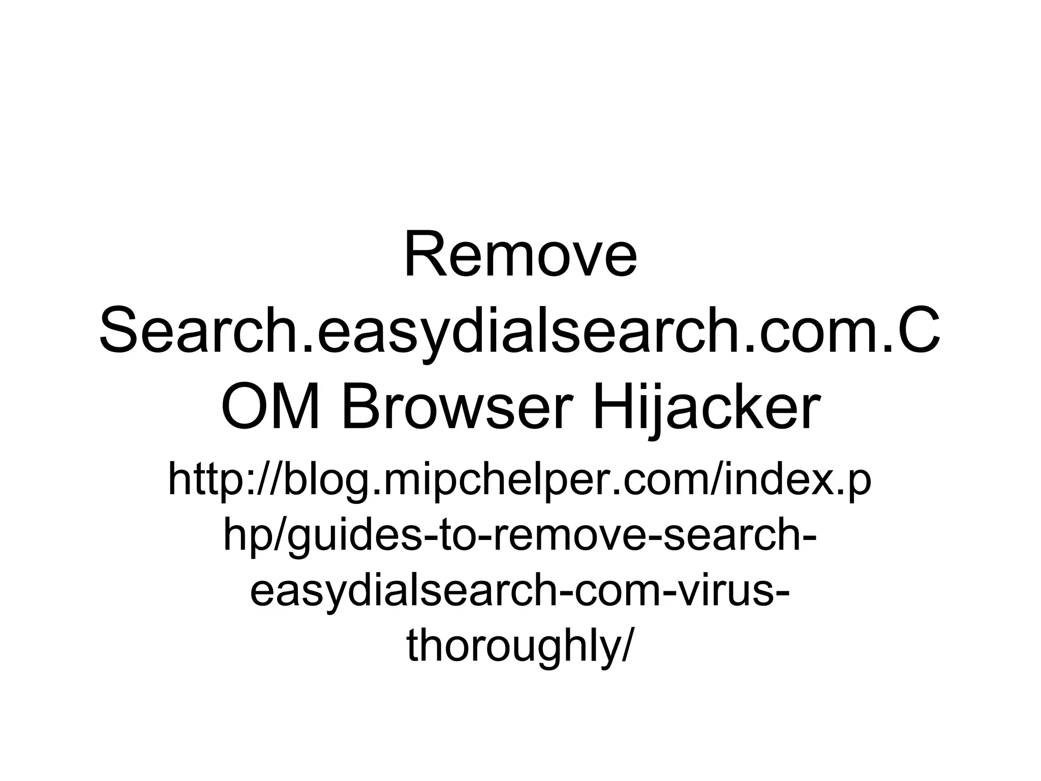 The document provides guidance on removing the browser hijacker search.easydialsearch.com, which alters browser settings to display unwanted ads. It explains how the hijacker installs alongside other software without user consent and describes its effects on browsing activities. Step-by-step instructions are given for ending malicious processes, uninstalling related software, resetting browser settings, and deleting associated files and registry entries.