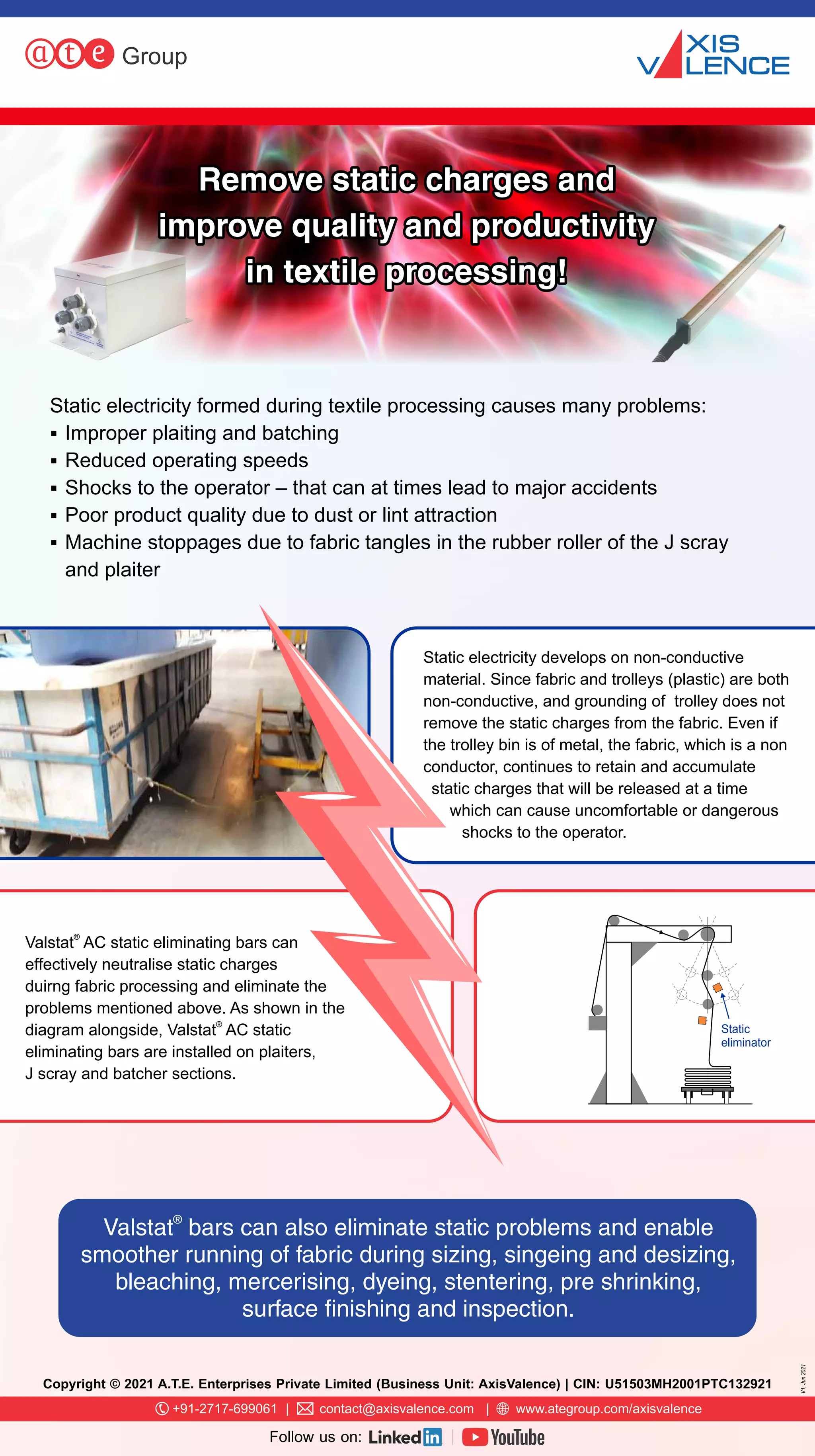 Static electricity accumulates on non-conductive materials like fabric and plastic trolleys, causing issues such as machine stoppages, reduced speeds, and operator shocks during textile processing. Valstat AC static eliminating bars effectively neutralize these static charges, enhancing quality and productivity throughout various fabric processing stages. Their installation can lead to smoother operation and improved product quality.