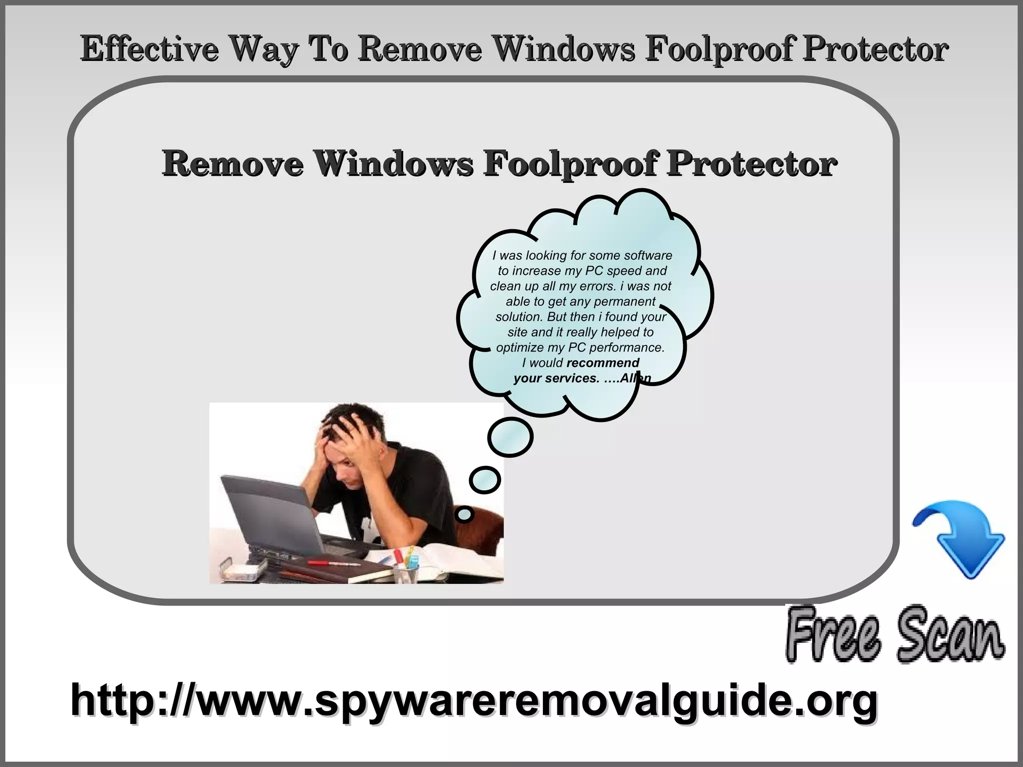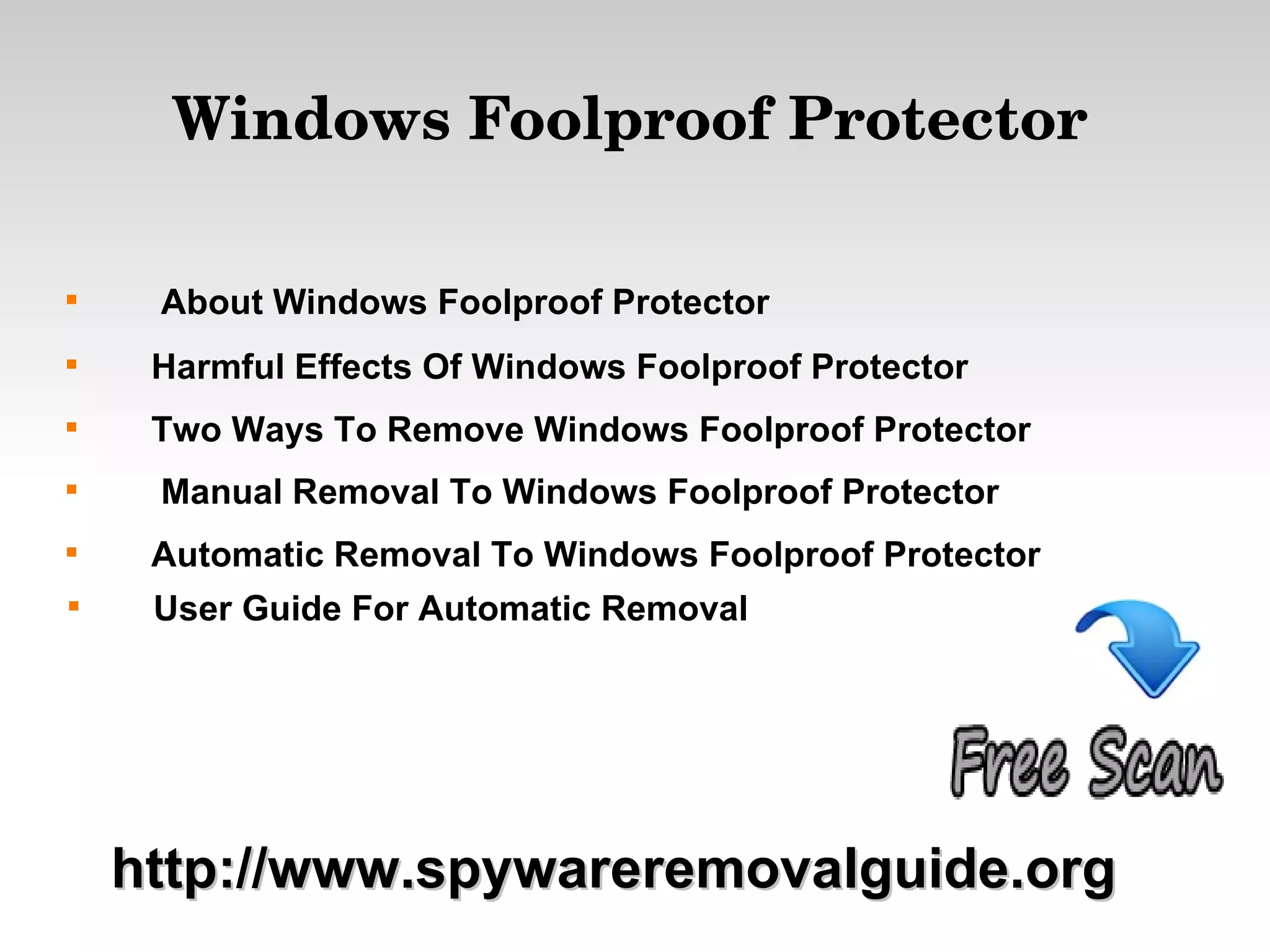 Windows Foolproof Protector is a malicious application disguised as a security program that can slow down system performance and present false error messages. It can be removed manually by deleting registry entries and supporting files or automatically using a dedicated removal tool. The document outlines the harmful effects and provides step-by-step instructions for both removal methods.