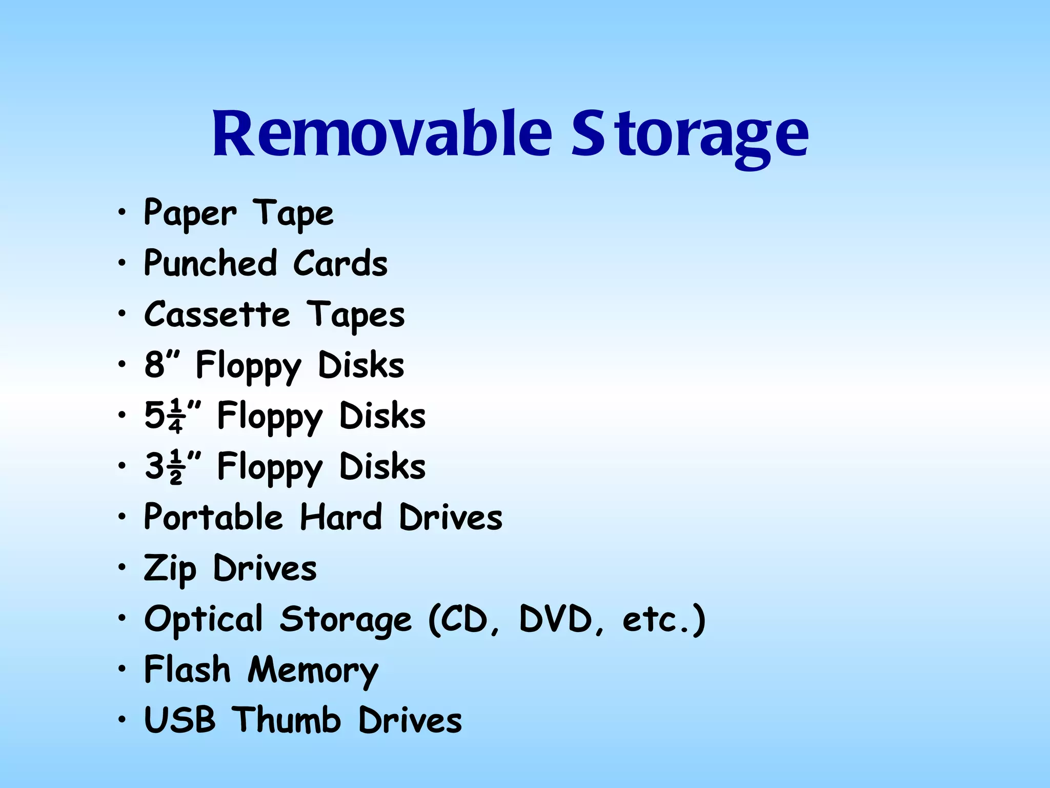 The document summarizes the history and evolution of removable storage technologies from paper tape in the 1700s to modern USB thumb drives. It describes early technologies like punched cards, cassette tapes, floppy disks of various sizes, portable hard drives, Zip drives, and optical discs. Key points included the increasing storage capacities over time, from kilobytes to megabytes to gigabytes, as well as the advantages and disadvantages of each technology as newer options emerged.