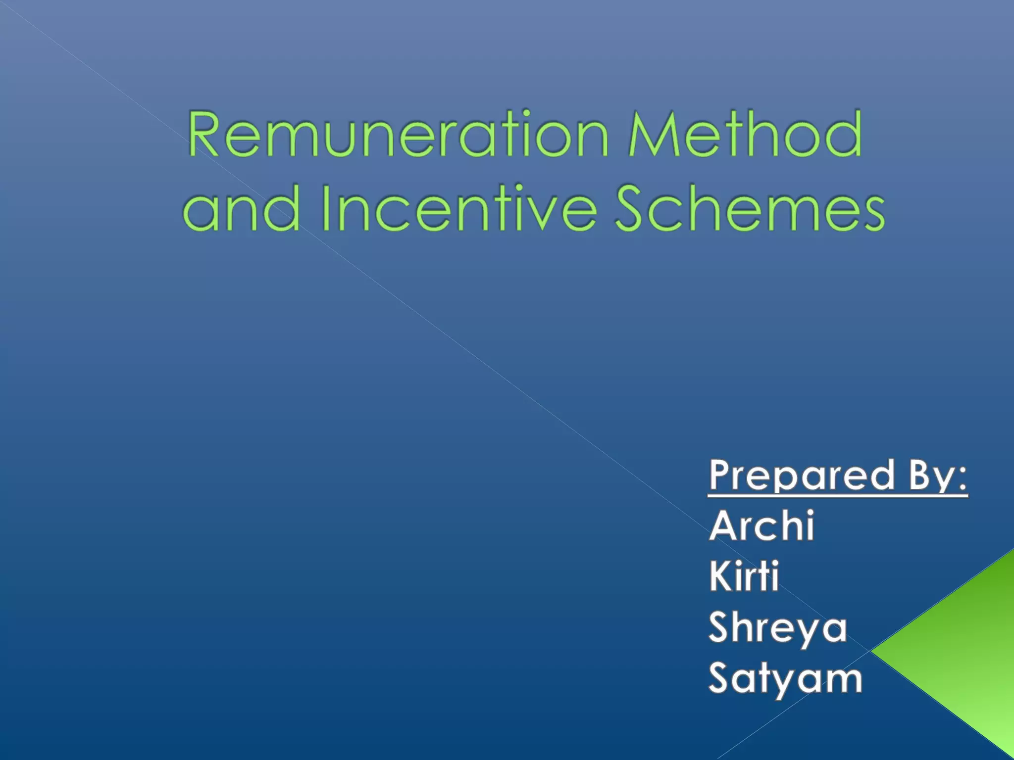 This document discusses different methods of remuneration or compensation for employees. It begins by defining remuneration and incentives. It then outlines characteristics of an effective remuneration system and classifies remuneration methods. The key remuneration methods discussed are time-based rates, piece rates, and combined time and piece rates. Within these categories, several specific plans or variants are examined such as flat time rates, high wage systems, straight piece rates, and bonus systems. The advantages and disadvantages of each method are also assessed.